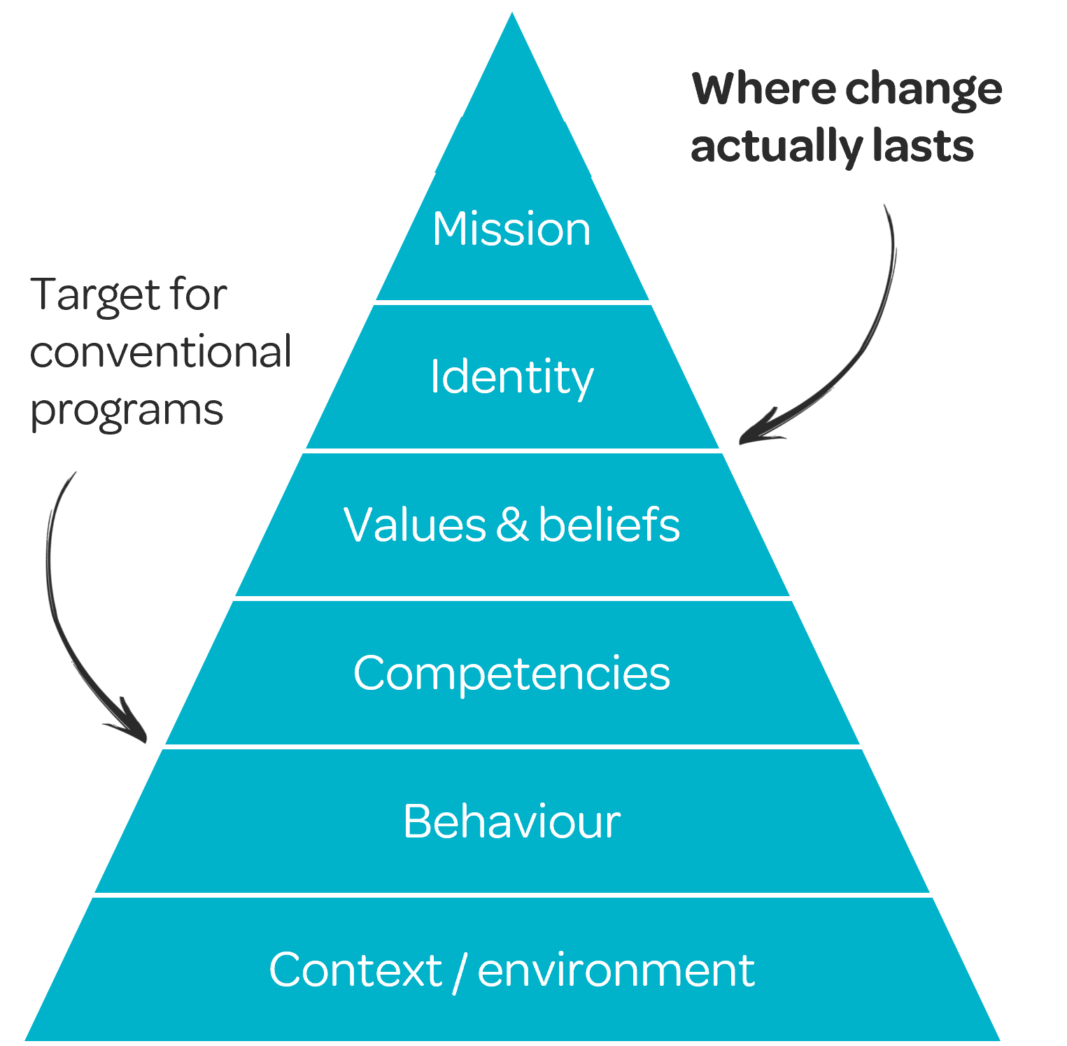 Lasting development happens on a deeper level: at the level of beliefs, internal narratives and identity.